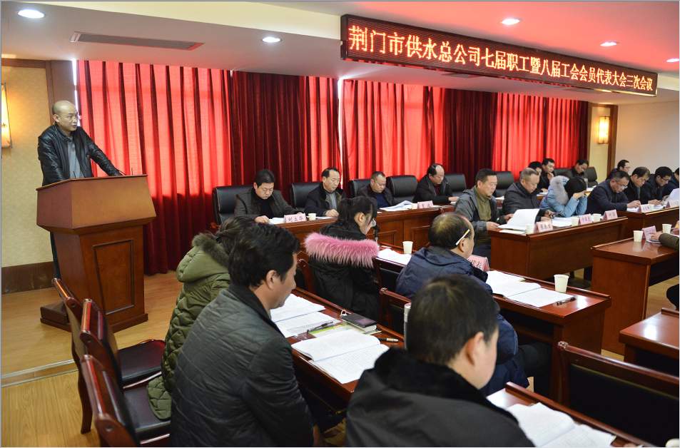 會議在莊嚴的國歌聲中開幕。公司黨委書記、總經(jīng)理陳永根作了《2016年度公司工作報告》,認真總結了2016年度取得的各項成績;供水設施建設投資體制理順、5條道路供水管道改遷提前完成、國賓酒店環(huán)評獲批;管黨治黨高度前所未有、項目建設力度規(guī)??涨?、公司主輔業(yè)產(chǎn)值連續(xù)五年雙過億,總額首次突破3億元等??陀^分析了當前企業(yè)發(fā)展存在的機會和挑戰(zhàn),并對2017年度的工作作出了展望。黨委委員、工會主席馬兆芳,黨委委員、總會計師劉高軼分別作了《2016年度工會委員會工作報告》、《荊門市供水總公司2016年度財務預算執(zhí)行及2017年財務預算草案編制報告》、《荊門市供水總公司2016年度工會經(jīng)費執(zhí)行及2017年工會經(jīng)費預算情況報告》。職工代表提案審查小組組長卞軍虎對七屆職工暨八屆工會會員代表大會二次會議職工代表提案辦理情況作了報告,七屆職工暨八屆工會會員代表大會二次會議共收到34份職工提案,實際需要回復和辦理的提案為32份,已辦結的有27份,正在落實的5份,報告中對正在落實的提案進行了說明。工會副主席張春生對本次會議征集職工代表提案作了報告,本次會議共收到19份提案,其中涉及經(jīng)營管理的5份,技術改革的1份,教育培訓的1份,薪資福利待遇的12份。會議期間,與會代表給予六個報告充分肯定,圍繞各項工作報告,進行了熱烈討論,提出了許多寶貴的建議和意見。
